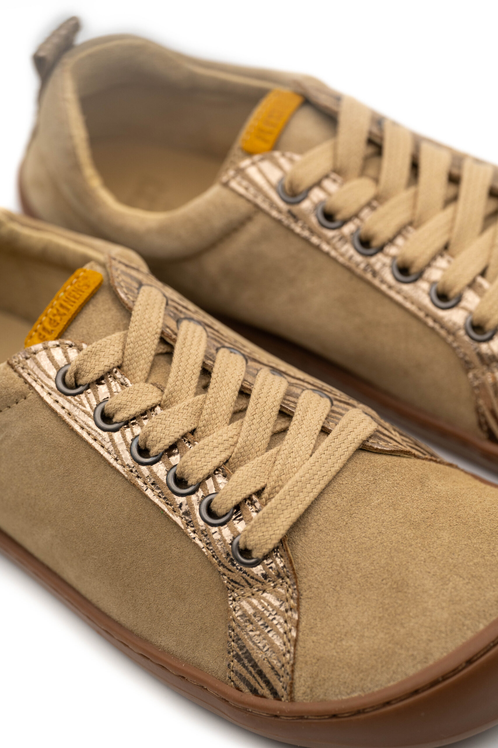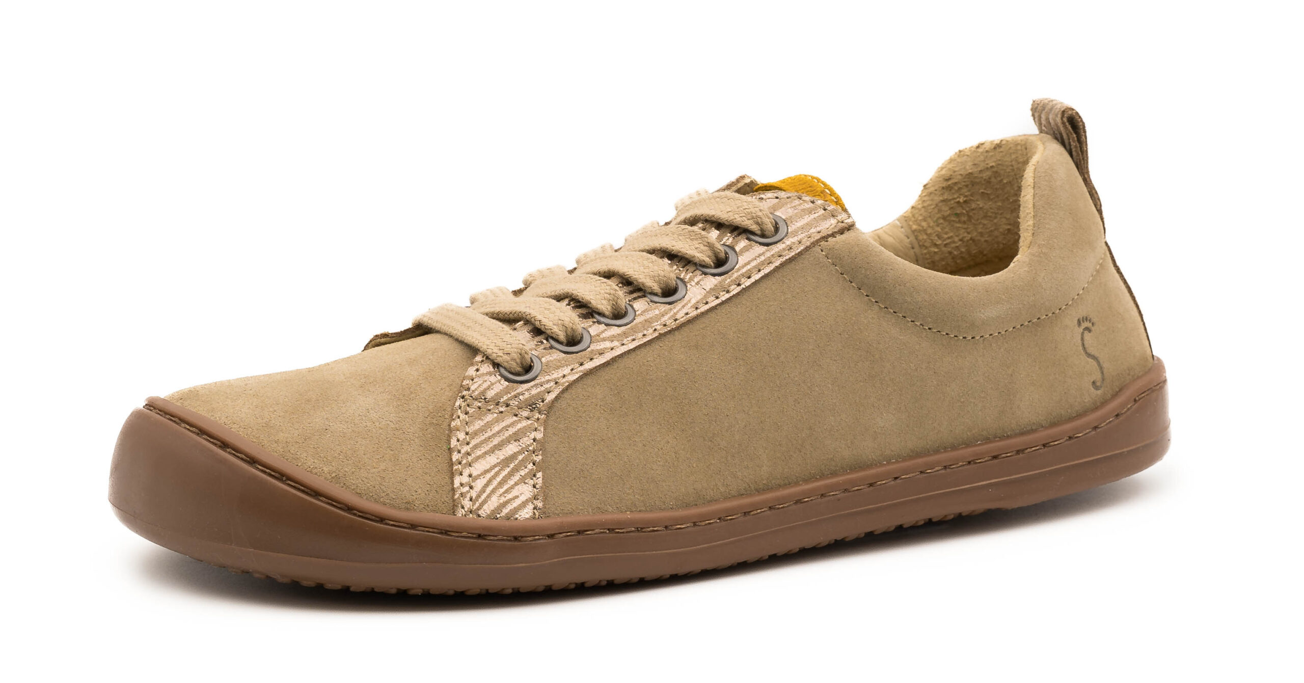 ZAPATO RESPETUOSO (BAREFOOT) PARA MUJER DE PIEL DE SERRAJE CON UN ADORNO ANIMAL PRINT EN DORADO. CIERRE CON CORDONES.